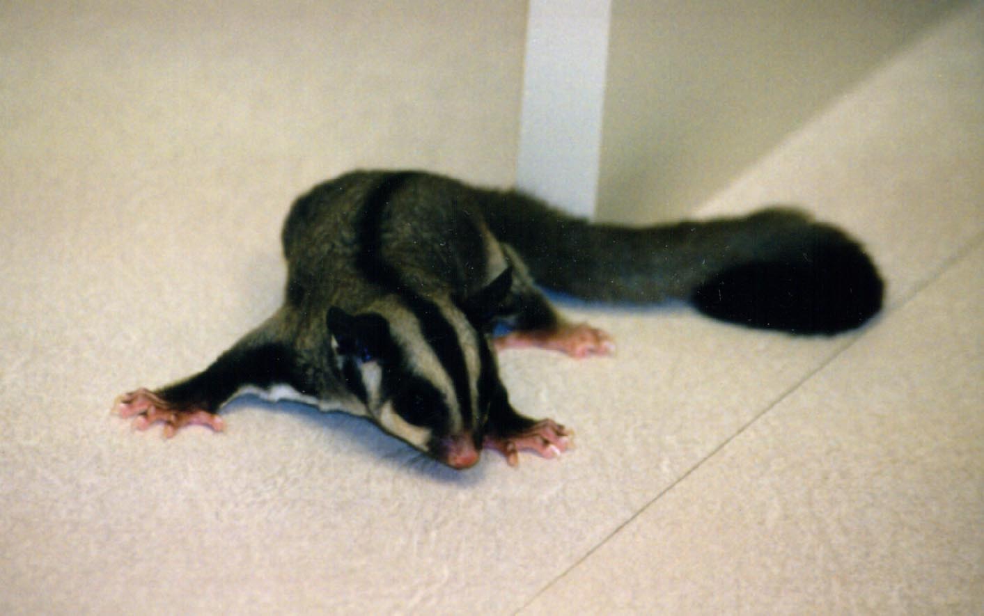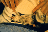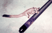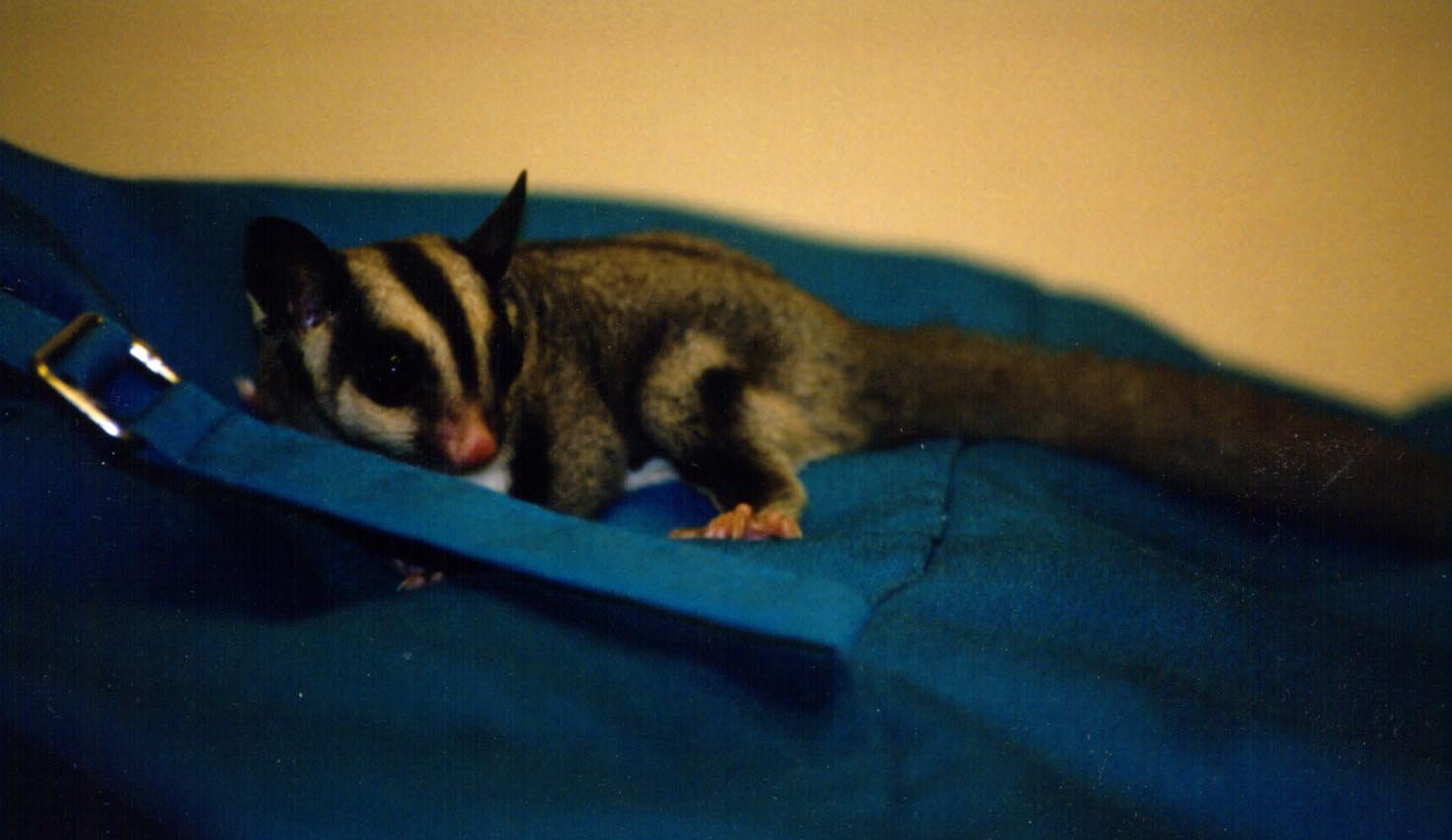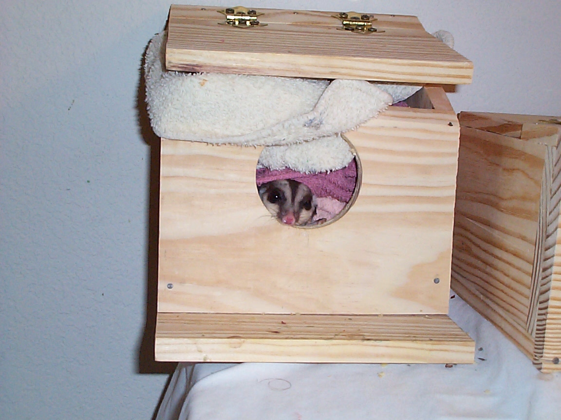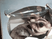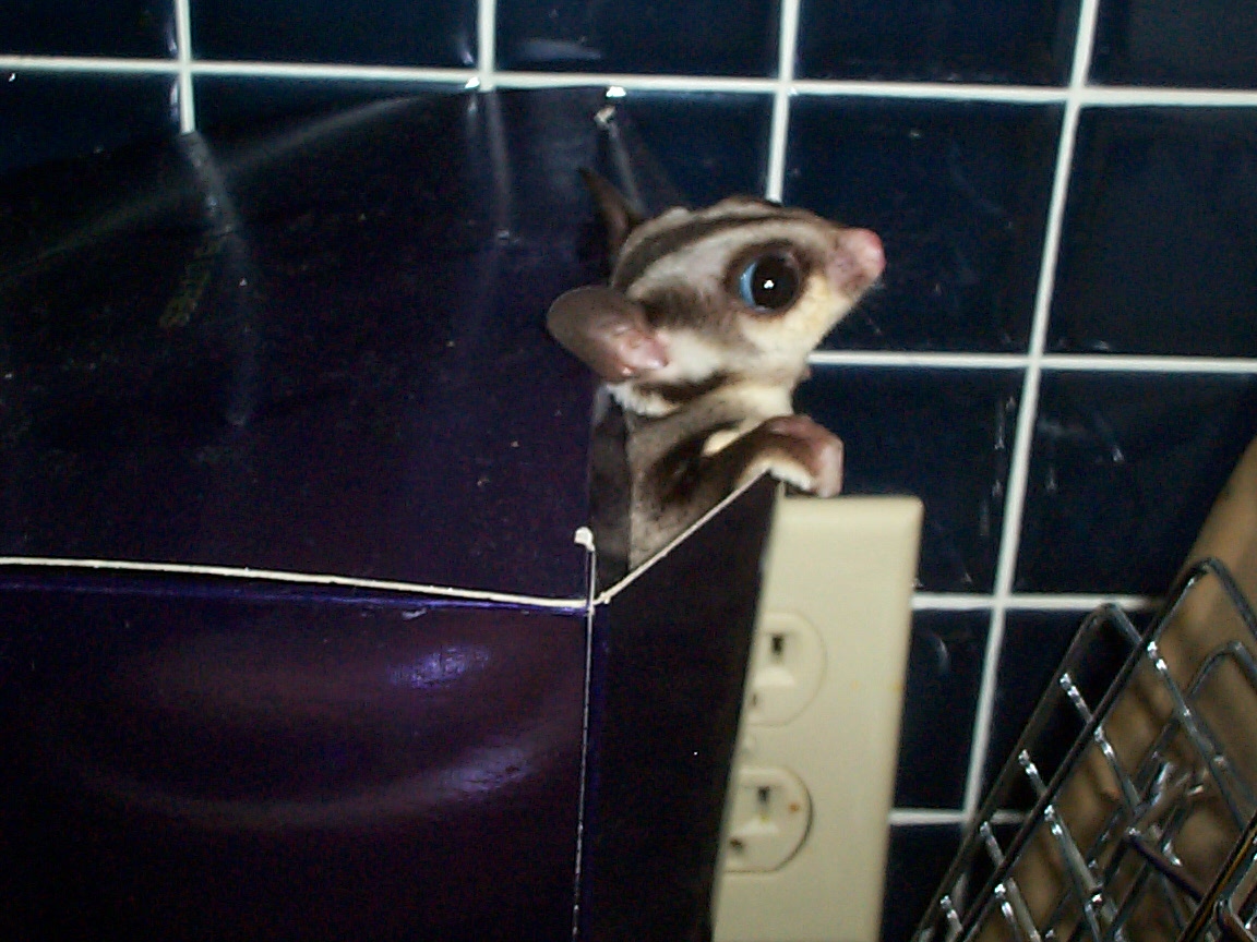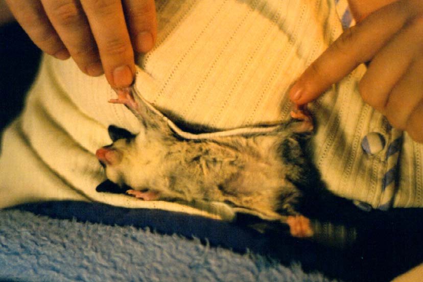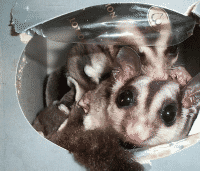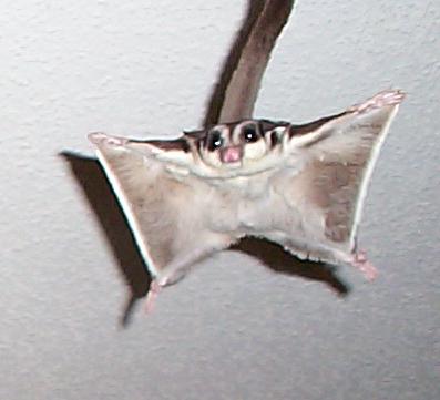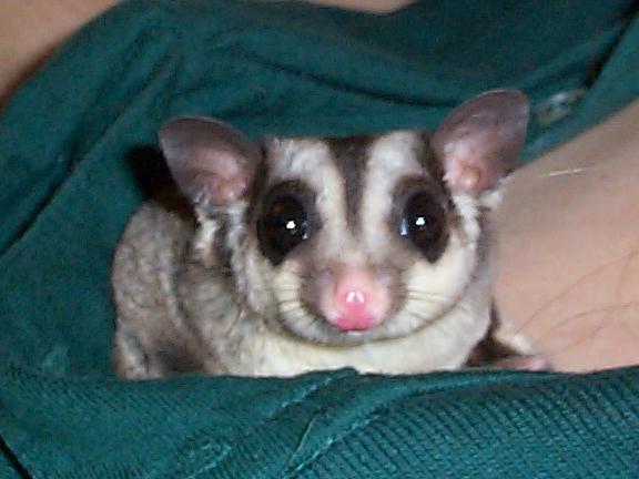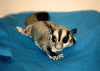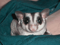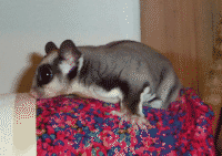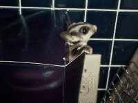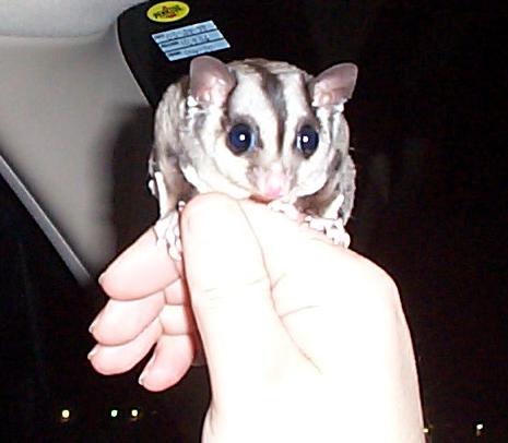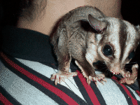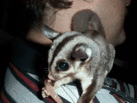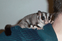 Vicki is a "sugar glider", which is a marsupial originally from Australia. They are much like a "flying squirrel", about the size of the palm of your hand, with a tail about as long as their body. They are nocturnal but will play just about anytime that you wake them. To the uninitiated they seem like another gerbil or hamster, but I believe they are more intelligent and have alot more personality. Vicki seemed to learn her name and to come when she's called (well sometimes) when she was just a few weeks old.