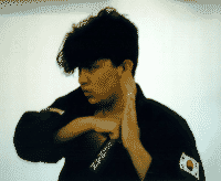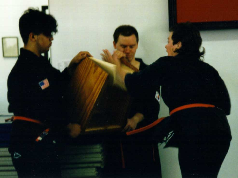 administering a black belt test to 6 of his pupils on
